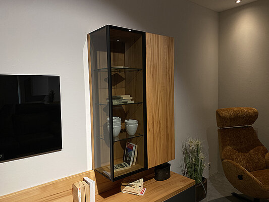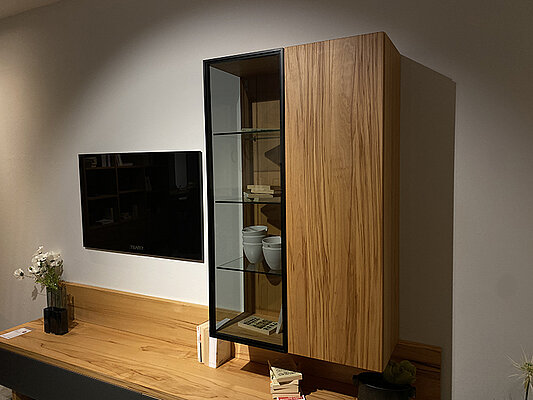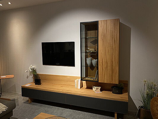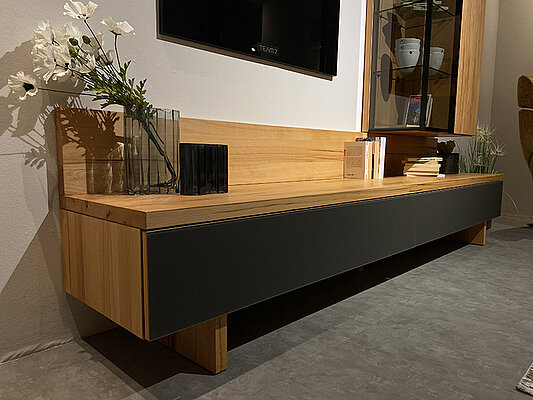 Wohnwand Cubus von Team 7, in Kernbuche, Absetzung graphitgrau, BHT ca. 260/197,4/48,3 cm.